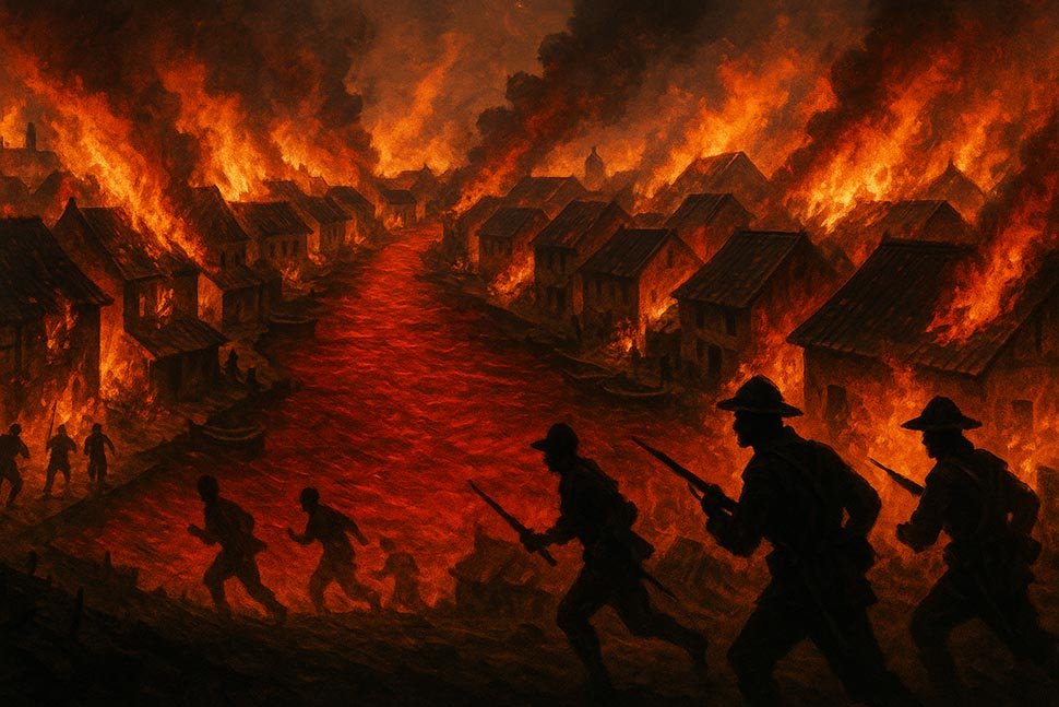 Asap pertama terlihat dari kawasan Pecinan Lama, tak jauh dari Stadhuis. Rumah-rumah di sepanjang Kali Besar mulai terbakar. Perempuan, anak-anak, dan orang sakit dikejar keluar rumah, dibunuh di jalanan. Bau darah bercampur kayu terbakar memenuhi udara.