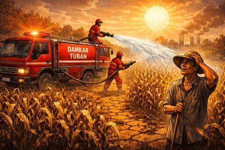 Damkar Tuban benarkan petani minta menyiram lahan jagung Saat dikonfirmasi, Plt Kepala Satpol PP dan Damkar Tuban, Sutaji, membenarkan peristiwa itu terjadi pada Rabu (01/04/2026) di Kecamatan Merakurak. “Iya saya dapat laporan dari warga seperti itu minta bantuan kami menyiram lahan jagung,” ujarnya.