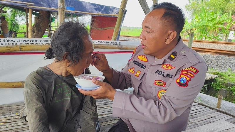 Ipda Purnomo saat menyuapi ODGJ yang ditemukan di jalan. (Foto:Istimewa)