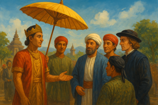 Pada masa Majapahit, interaksi ini makin ramai. Prasasti Balawi (1305) mencatat daftar panjang tamu internasional: Keling, Singhala, Arya, Cina, Campa, Khmer, bahkan Bebel dan Mambang. Bayangkan pelabuhan di Tuban atau Gresik waktu itu seperti bandara internasional tanpa aspal ramai, penuh dialek, aroma rempah, dan suara tawar-menawar.