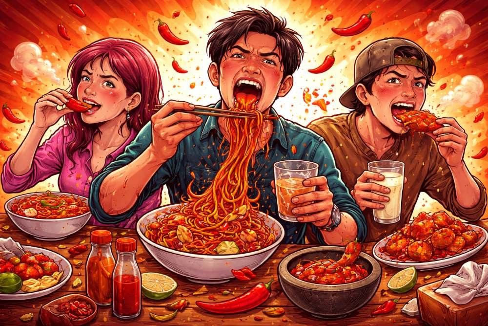 Level pedas sering jadi tantangan. Siapa paling kuat? Siapa tahan tanpa minum?