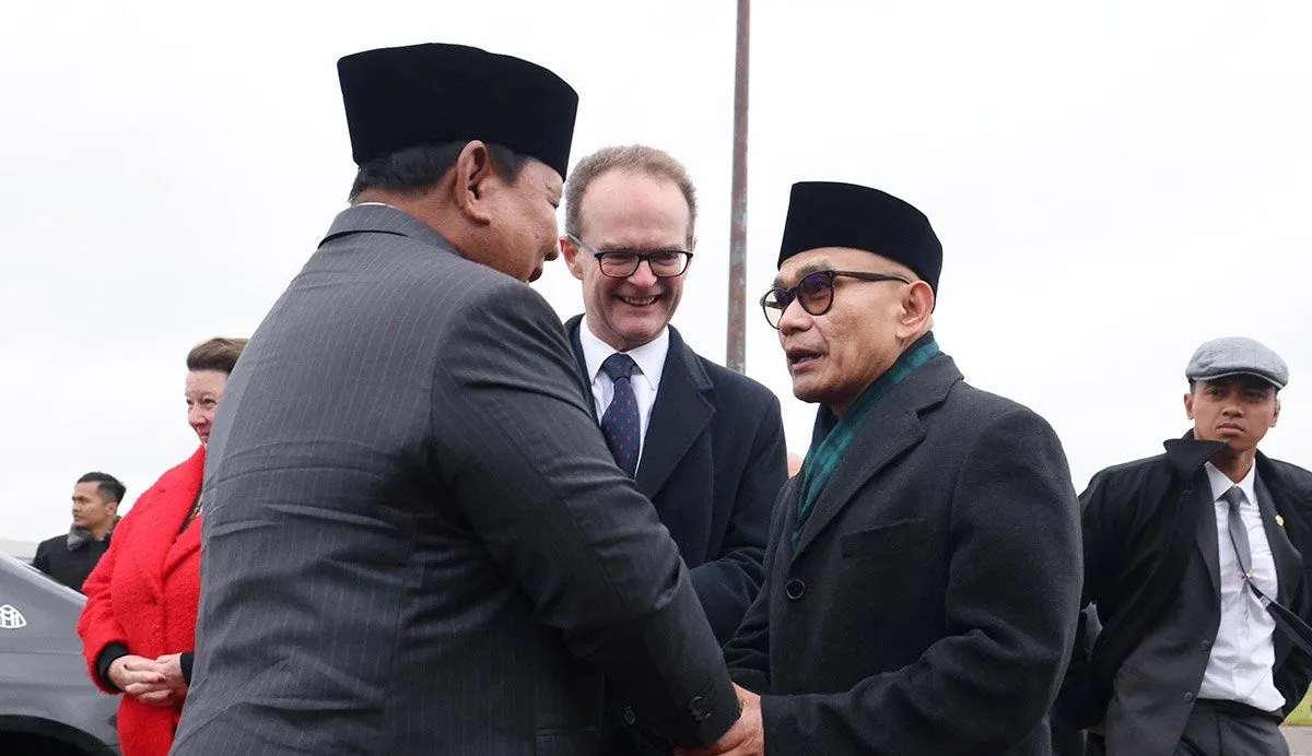 Presiden Prabowo Subianto menyalami Dubes RI untuk Inggris dan Irlandia Desra Percaya di Bandara Stansted, London, Rabu (21/2/2026). (Foto: ANTARA/Galih Pradipta)