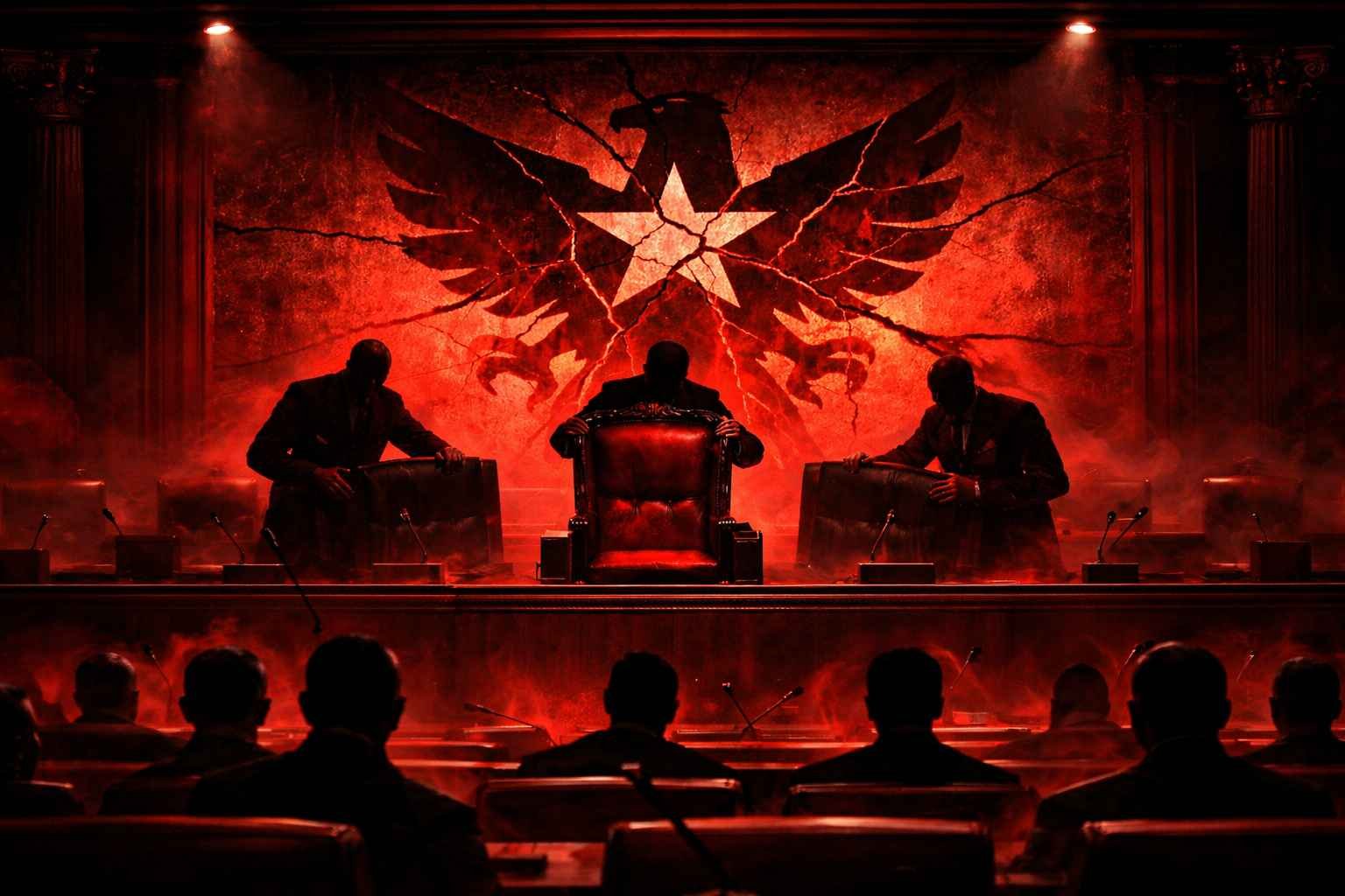 Ilustrasi tentang bayangan perebutan kursi kekuasaan di ruang parlemen, dengan simbol demokrasi yang retak sebagai metafora stagnasi politik. (Foto ilustrasi Tabooo.id)