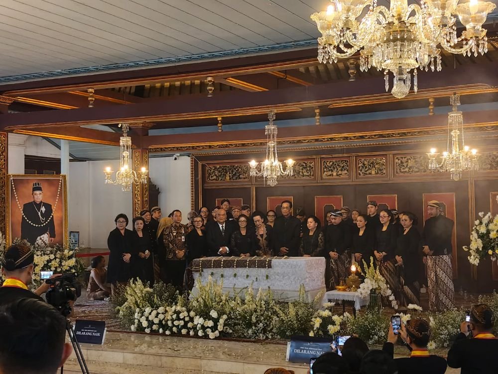 Di sisi barat Sasana Sewaka, Sultan menatap peti putih yang terbungkus kain batik. Ia menangkupkan tangan, memanjatkan doa di tengah kepulan asap dupa yang menari pelan di udara. Paku Alam berdiri di sampingnya, ikut larut dalam keheningan yang terasa lebih berat daripada kata-kata.
